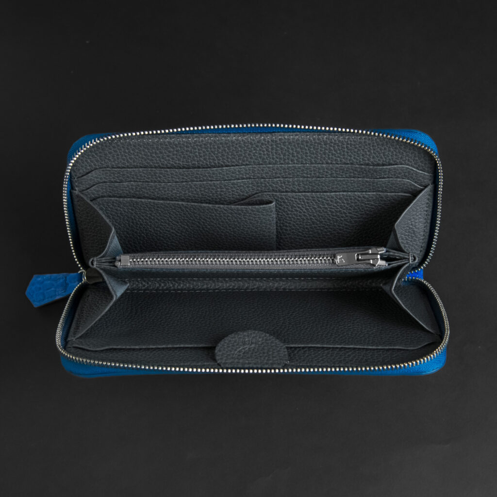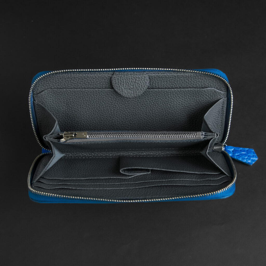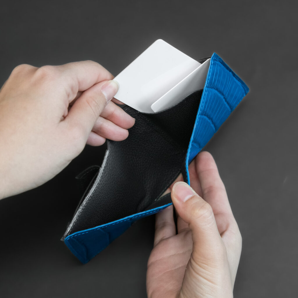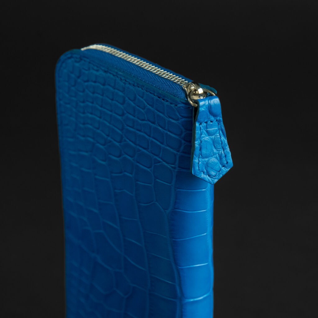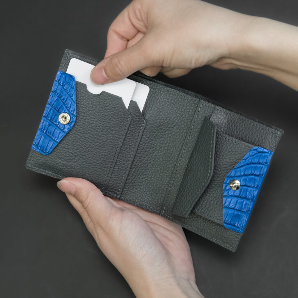 ワニ革は「エキゾチックレザーの王様」と称され、大きく「クロコダイル」「アリゲーター」「カマイン」の3種類があります。こちらの財布に使用しているのは、「アリゲーター」と言い、柔らかくしなやかな質感が特徴です。