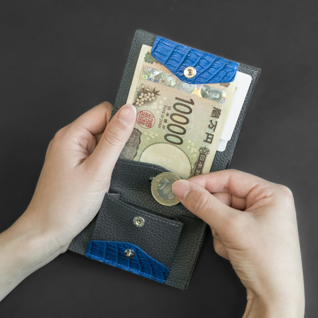 お財布を開いて向きを変えずにお札やコインの出し入れができるので、財布を持ち替えずに、サッとお会計を済ませることができます。