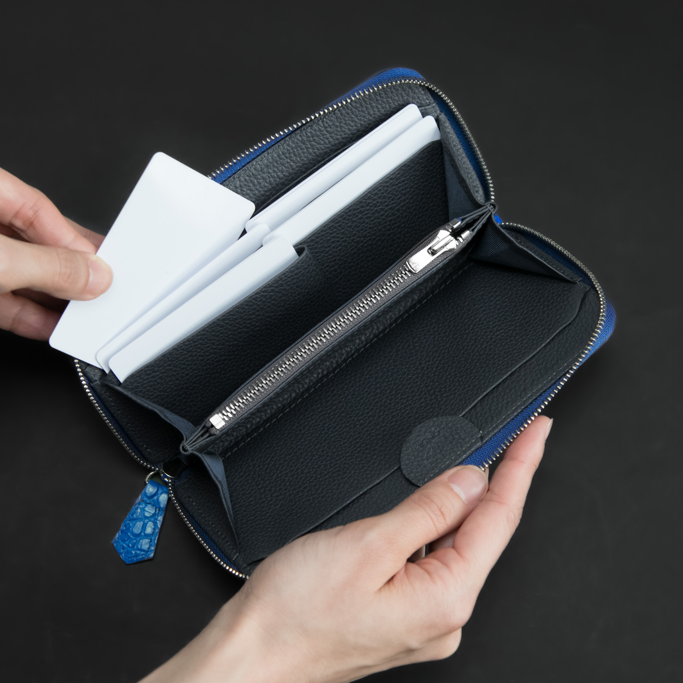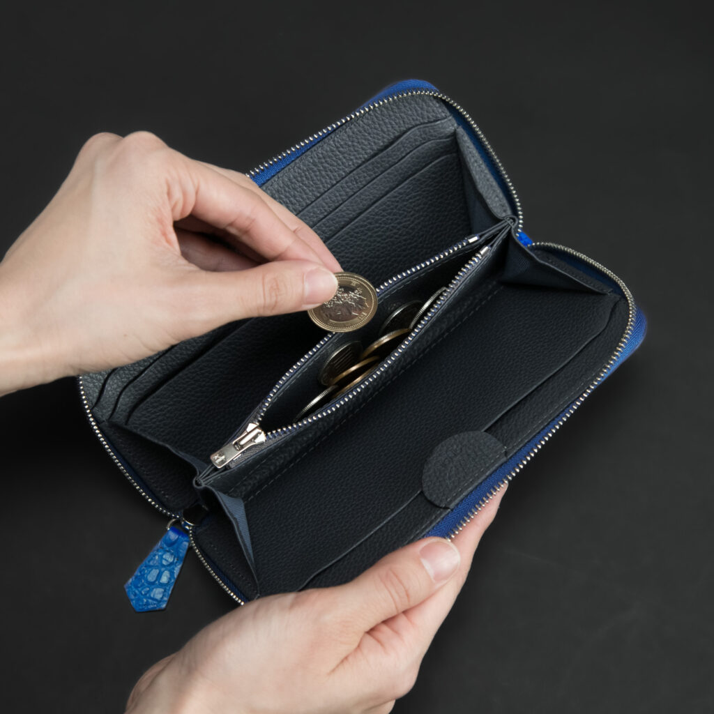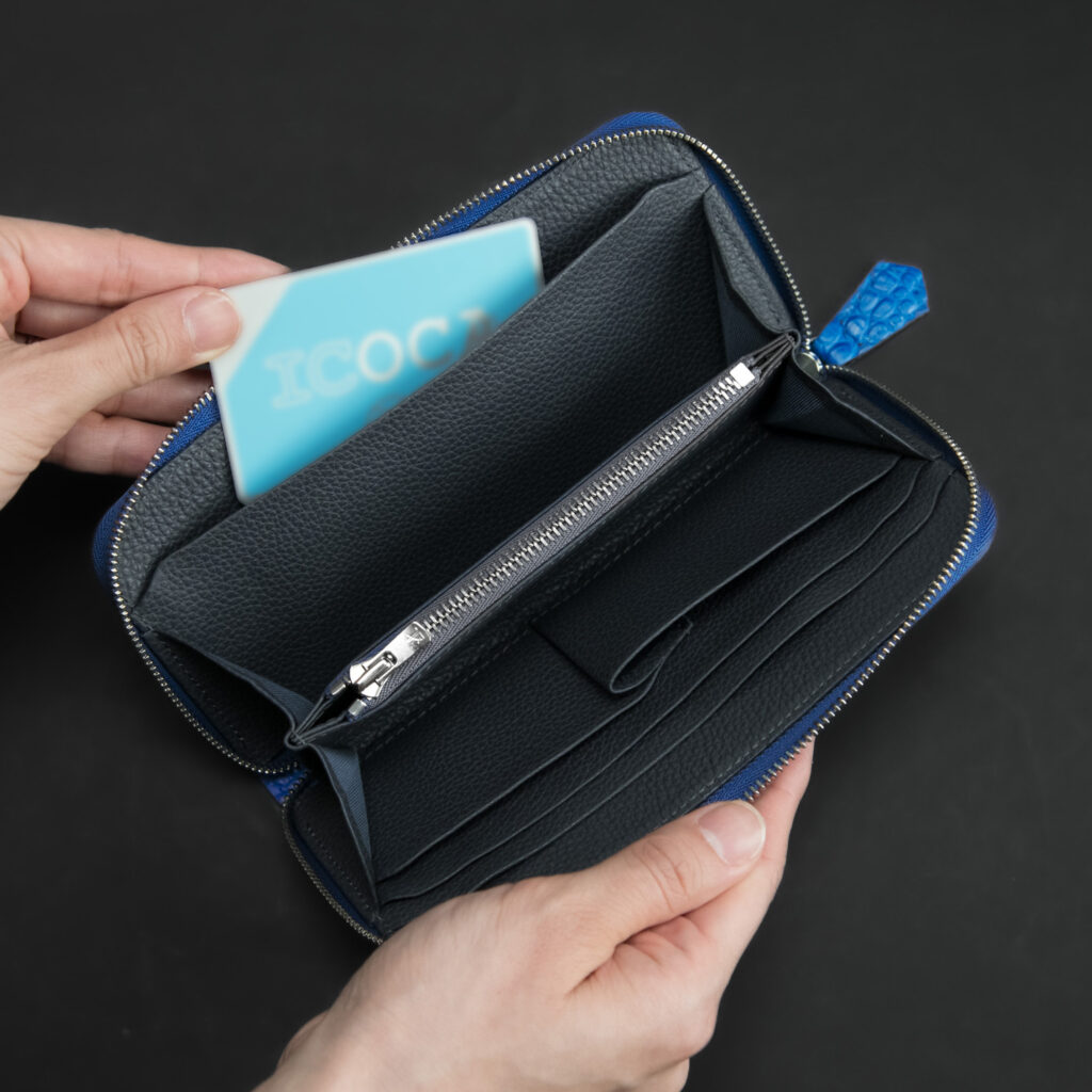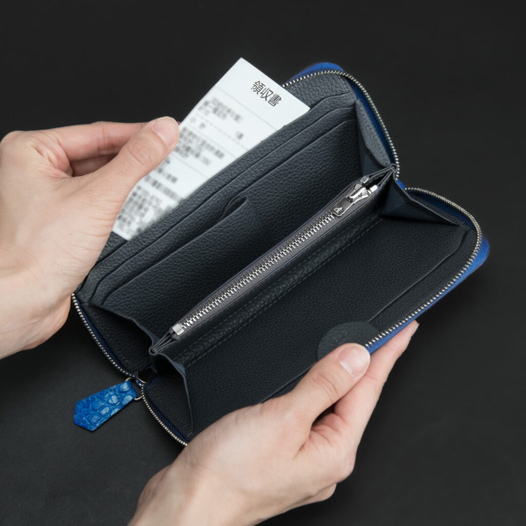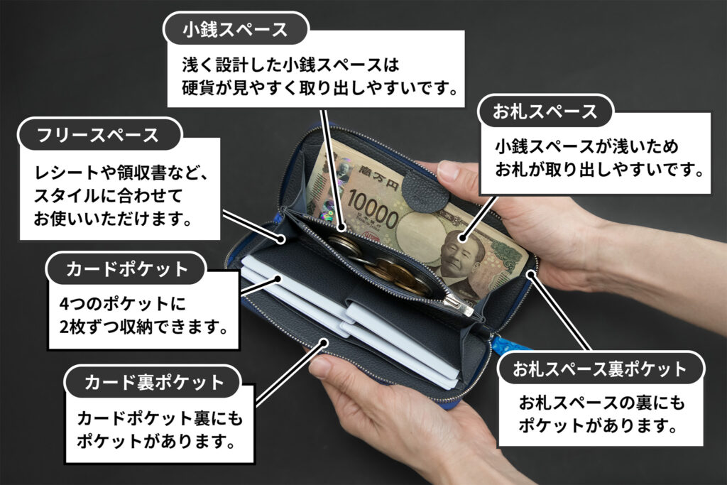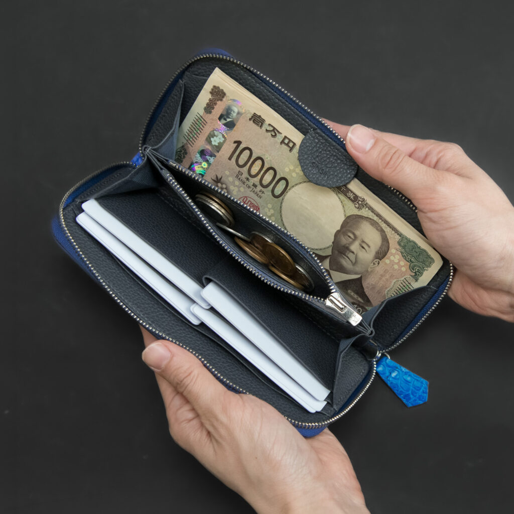 長財布の魅力はなんといっても収納力。従来のラウンドジップ長財布では無駄になっていたスペースを削ることで、コンパクトなのに大容量を実現しました。