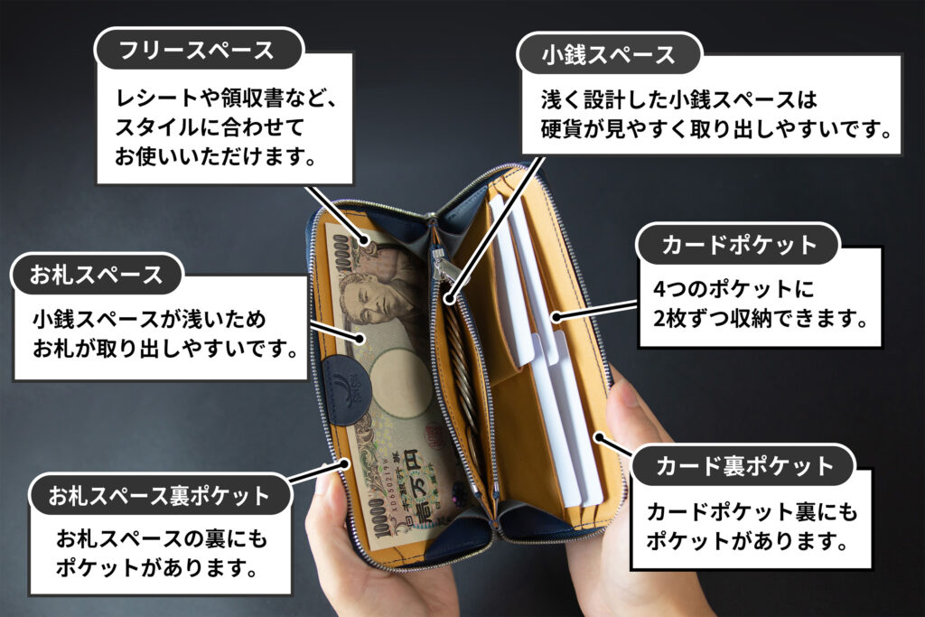 従来までのラウンドジップ長財布は小銭入れが深くて全体が見えづらく、取り出しにくいものが多かったため、改良を重ねました!小銭入れを浅くすることで無駄なスペースを削り、取り出しやすくなりました。