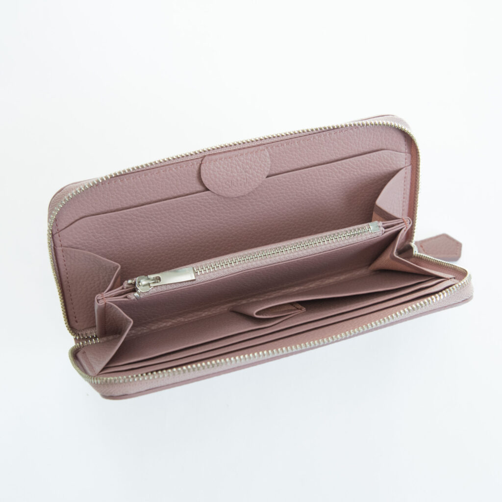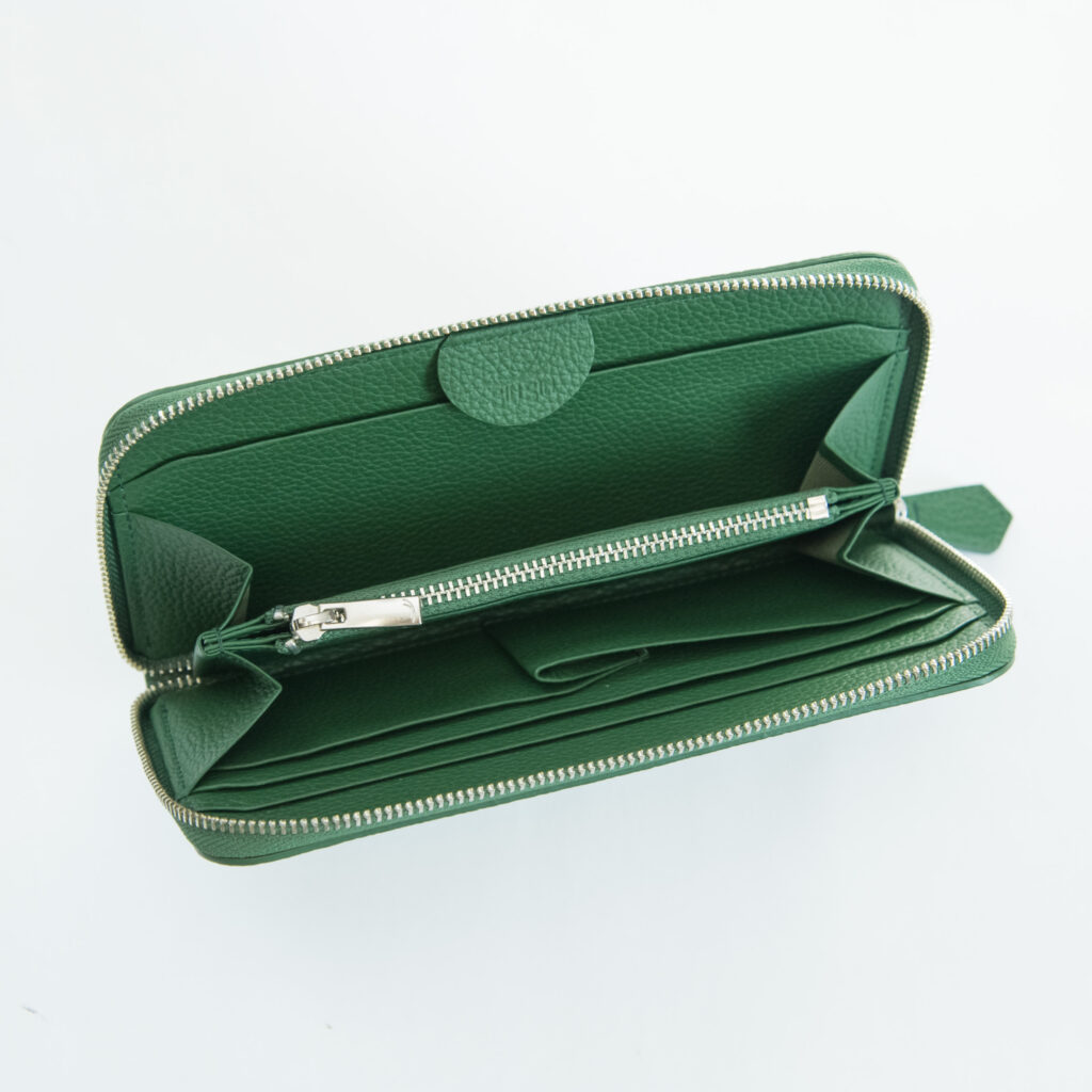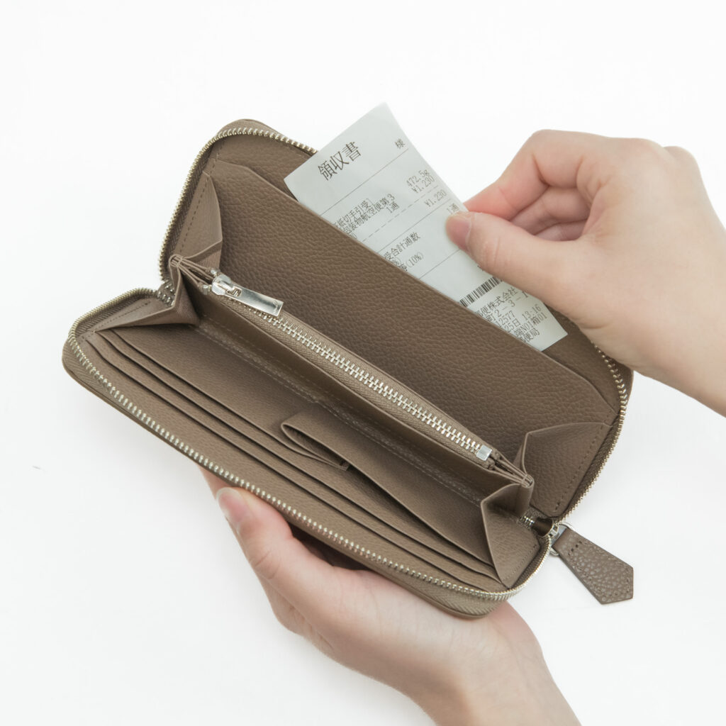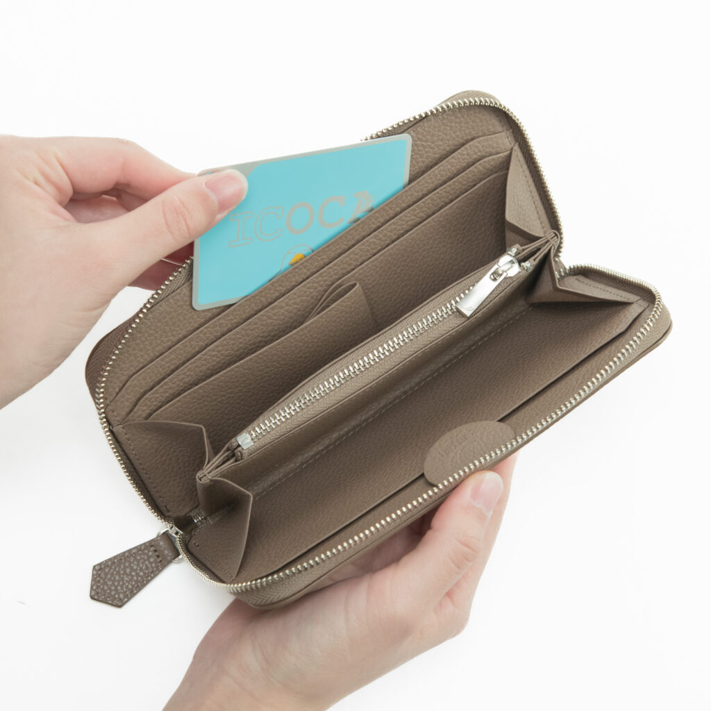 従来までのラウンドジップ長財布は小銭入れが深くて全体が見えづらく、取り出しにくいものが多かったため、改良を重ねました!小銭入れを浅くすることで無駄なスペースを削り、取り出しやすくなりました。