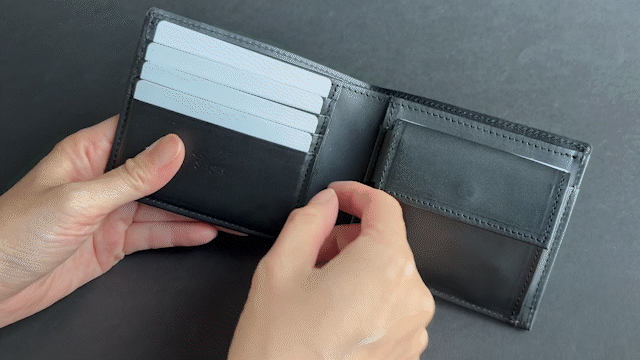 向かって奥はスムースレザーを、手前にはシャンタン生地を使用しているので、お札が引っ掛からずスムーズに出し入れできます。