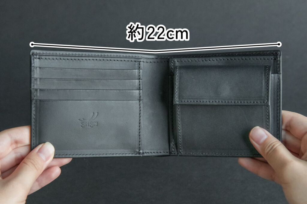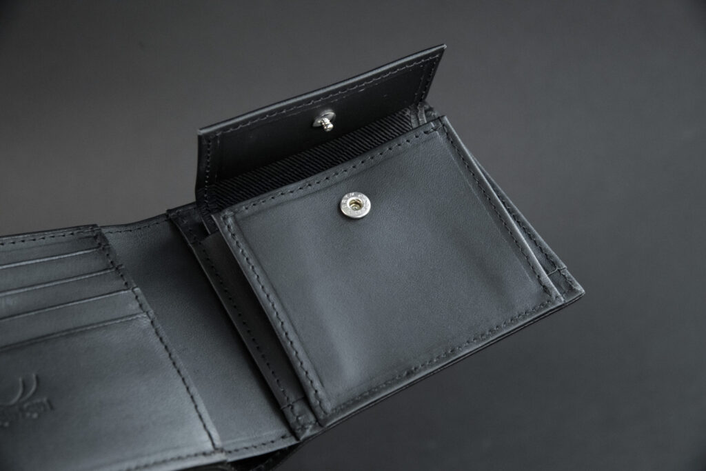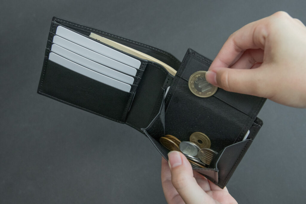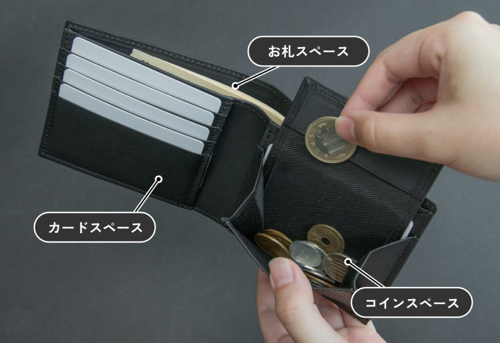 大きく開くマチ付コインポケットで小銭を約15枚程度収納できます。