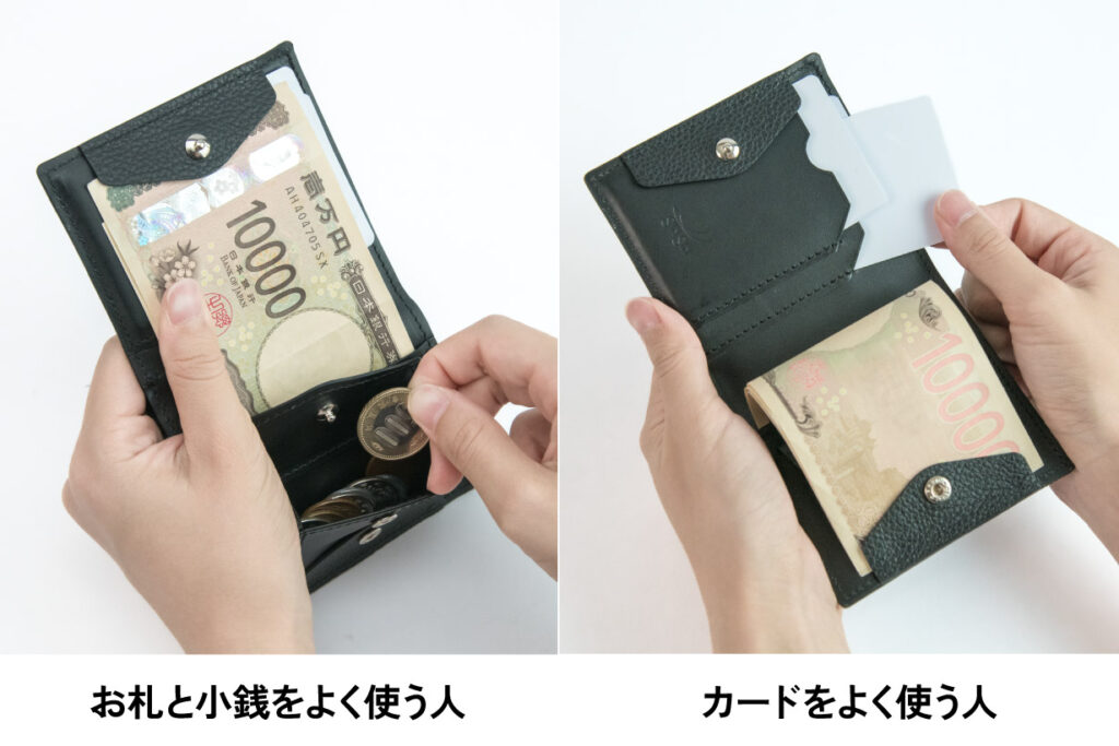 「お札と小銭をよく使う」という人もいれば、「カードをよく使う」という人もいるかと思います。お札の収納方法を変えることによって、そういった方それぞれに使いやすい設計にしました!