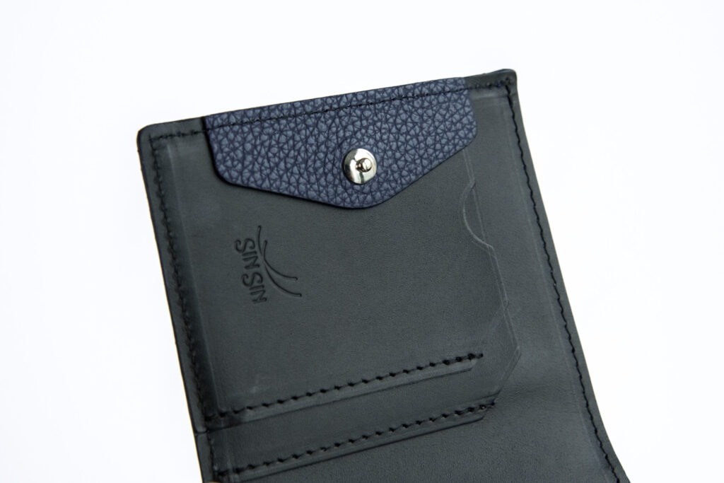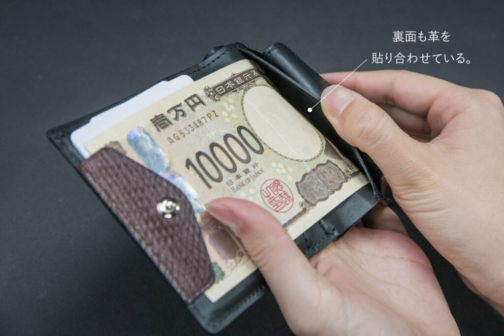 お札の出し入れをしやすくするために、財布の内側にも革を使いました。革の裏側そのままの場合、革の繊維質にお札が引っかかって出し入れがしにくくなりますが、両面に革を貼り合わせることでスムーズな出し入れが実現しました。