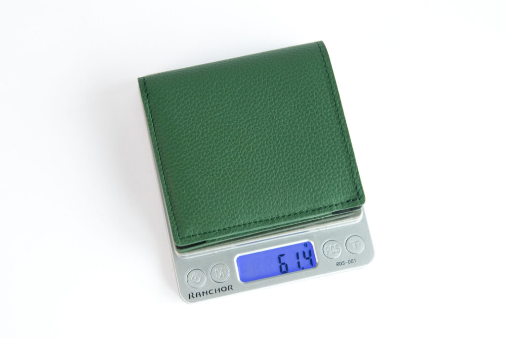 オールレザーの財布なのに、不必要なパーツを取り除くことにより、なんと「約61g」と、とても軽い財布にすることができました。