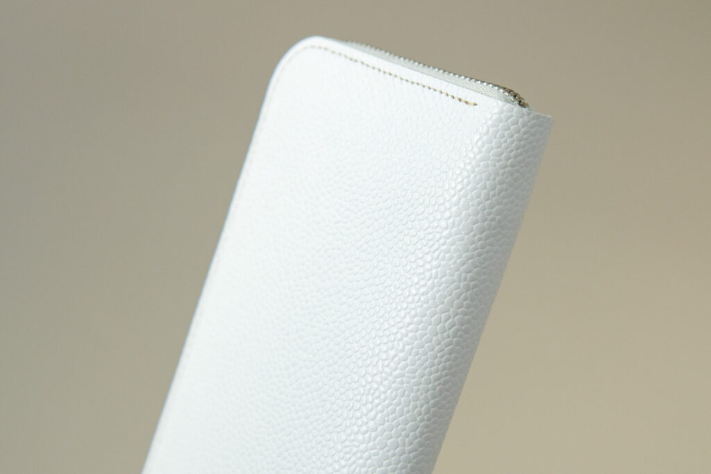 細やかで繊細な革表面の凹凸が、光をキラキラと反射するので高級感と華やかさを醸し出します。