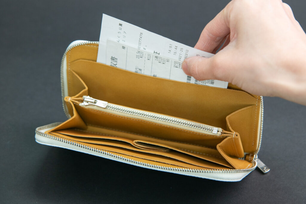 コンパクト財布ではあまり入れることが出来なかったレシートや領収書も、両側のフリーポケットに収納できます。