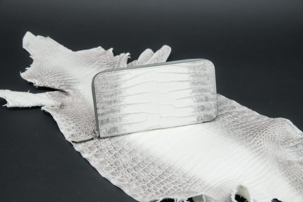 ヒマラヤ山脈の雪解けの情景から名づけられた「ヒマラヤクロコダイル」。その中でも一段と白さを誇る一級品、「ヒマラヤクロコダイル-snow white-」を今回3作品の長財布に特別に使用しています。