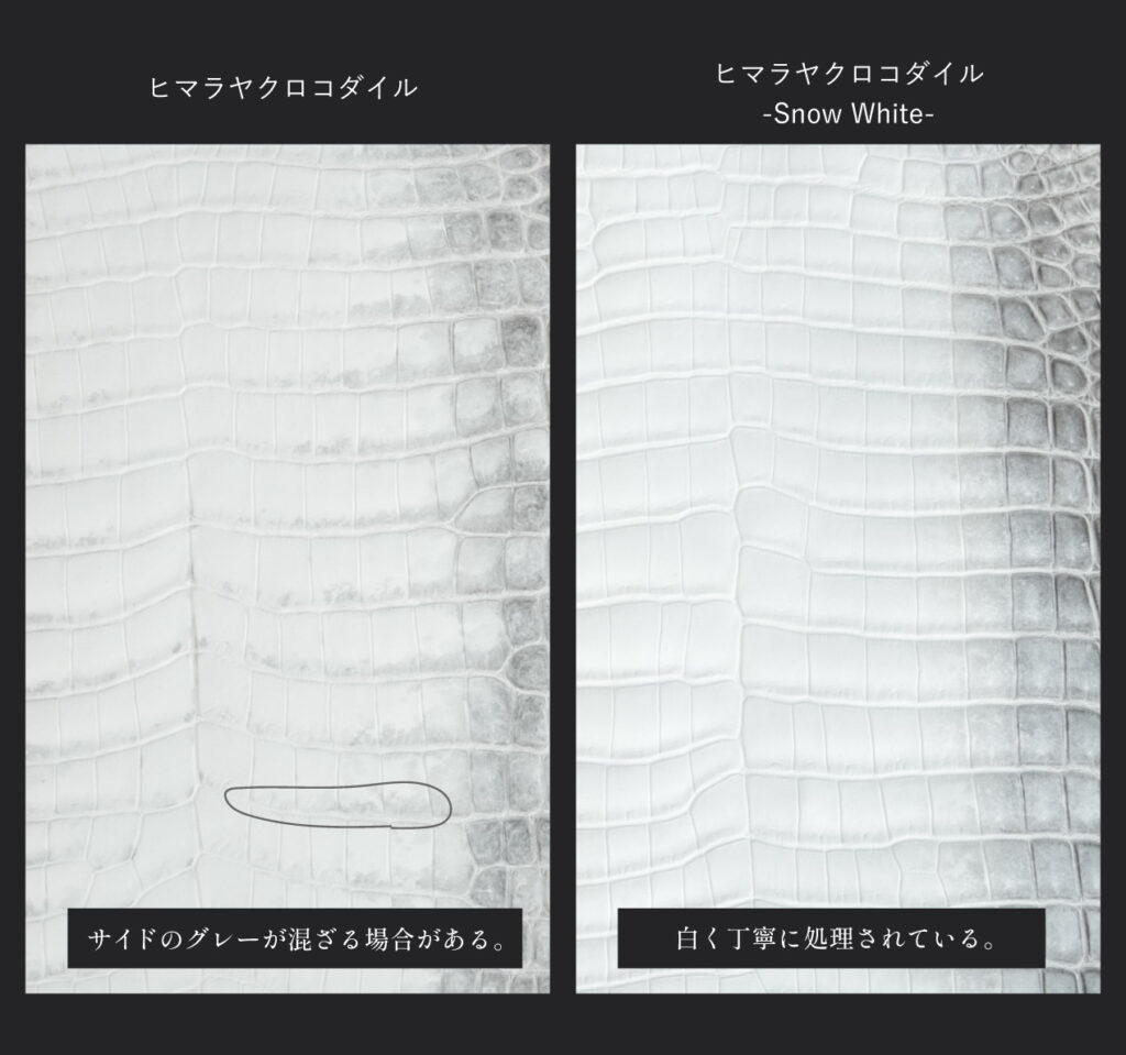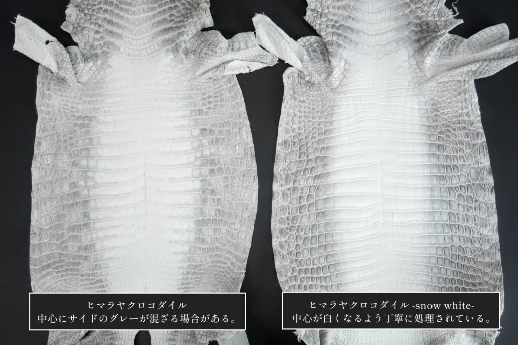 通常の「ヒマラヤクロコダイル」の場合、サイドのグレー部分が、中心の白い部分にも影響することがありますが、「ヒマラヤクロコダイル-snow white-」は中心部が真っ白になるよう丁寧に処理されております。