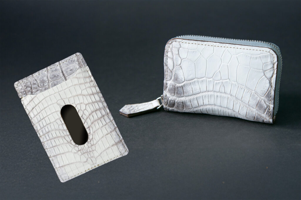 今回販売する2つ折り財布やパスケース、コインケースには「ヒマラヤクロコダイル」を、長財布には「ヒマラヤクロコダイル-snow white-」を使用しております。
