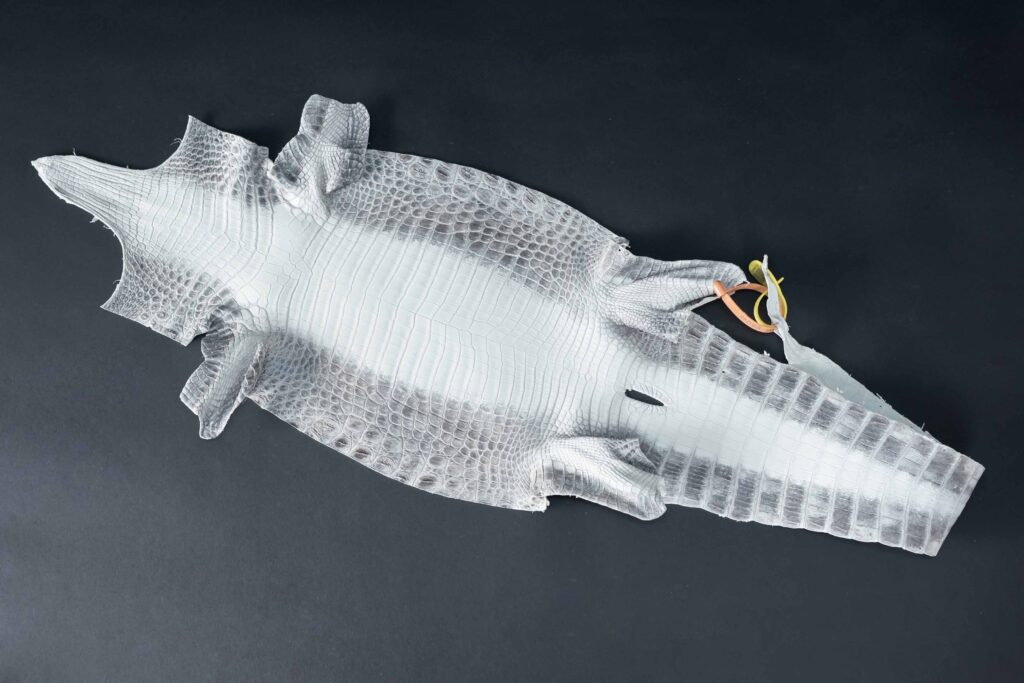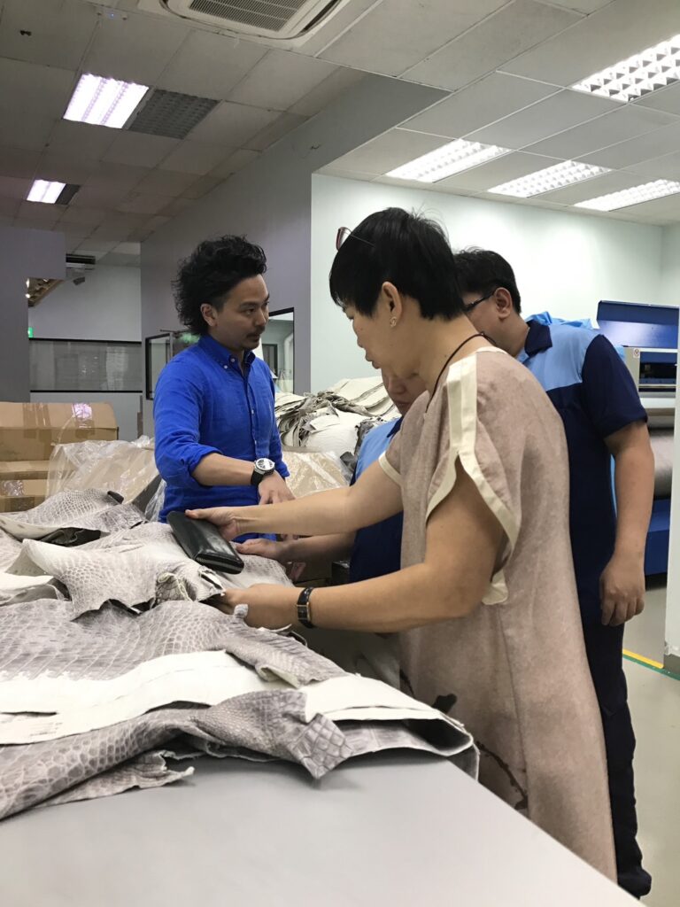 この作品に使用している「ヒマラヤクロコダイル」は、直接シンガポールの「ヘンローン社」から仕入れております。