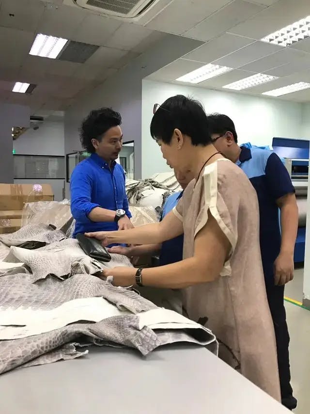 しかし、ヒマラヤクロコダイルを使ってこんな革製品を作りたいという夢を熱く訴えること約1時間。熱量のおかげか、革を作る職人(ヘンローン社の職人)と革製品を作る職人(新進工房)という職人同士ということもあってか、最終的にはヘンローン社の職人さんが僕たちのことを気に入ってくれて、無事にヘンローン社のヒマラヤクロコダイルを仕入れるパイプが繋がりました。本当に苦労しました。。笑