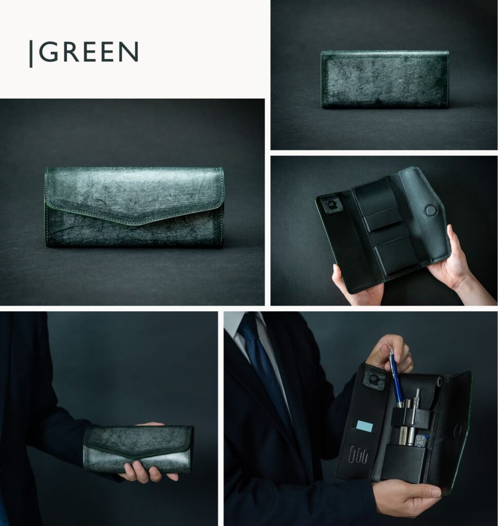 名刺などを忍ばせておけるカードポケット付き。