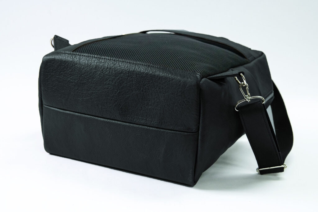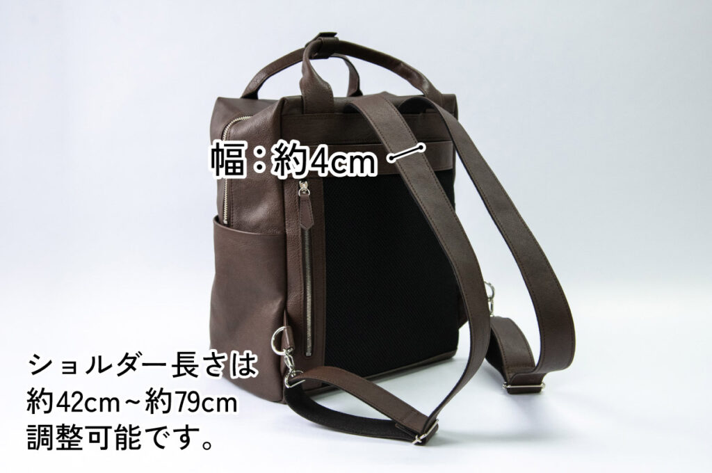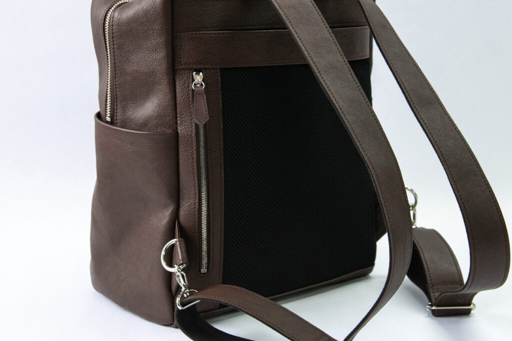 背中部分にはメッシュ生地を採用したので、革だと敬遠したくなる夏場などでもストレスなくご使用いただけます。