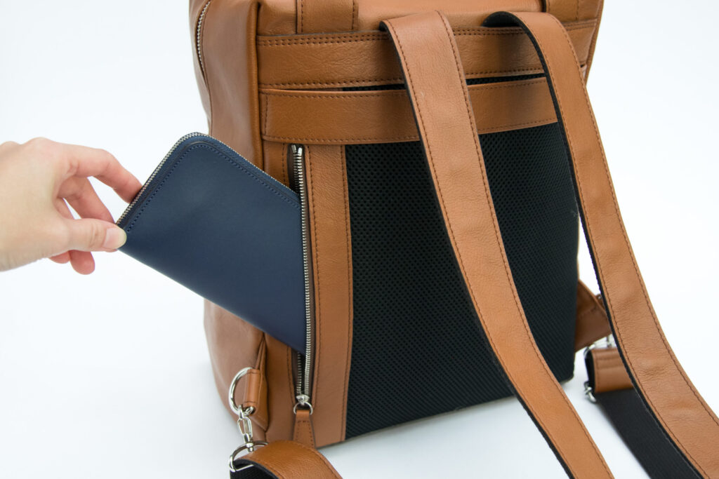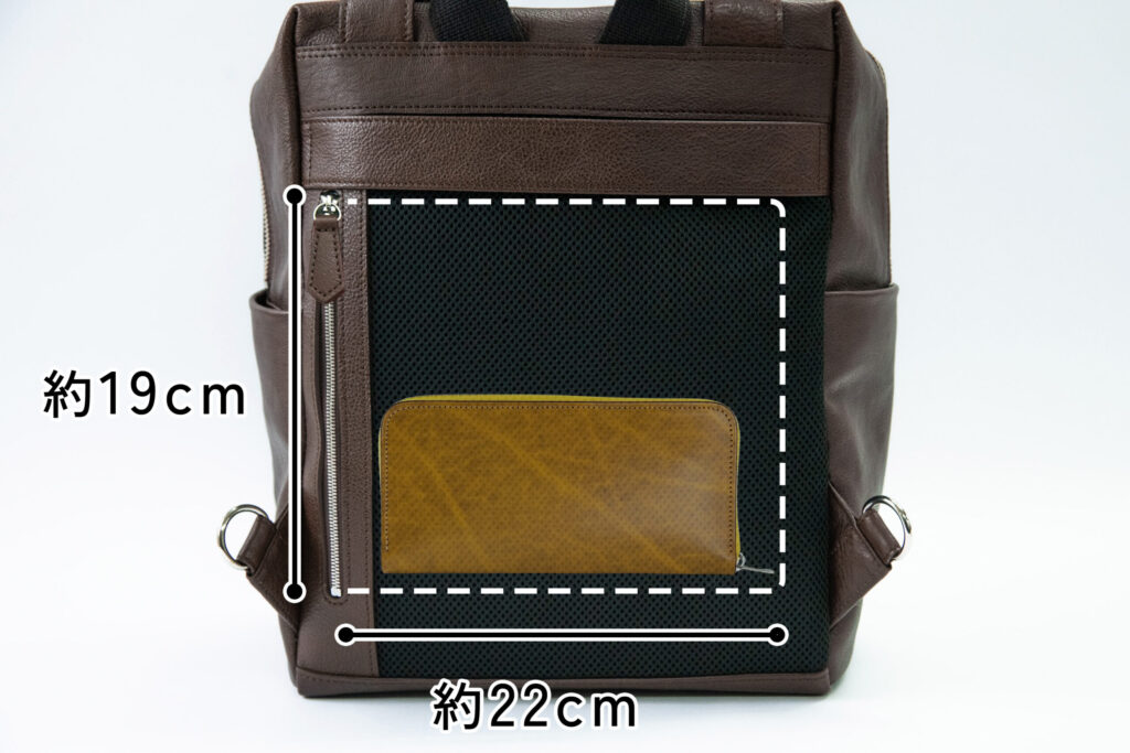以前のリュックでリクエストいただいた「極小長財布バタールを横向きで入れたい」というご意見にお応えして、横向きでも入るように奥行きのあるポケットにしました。