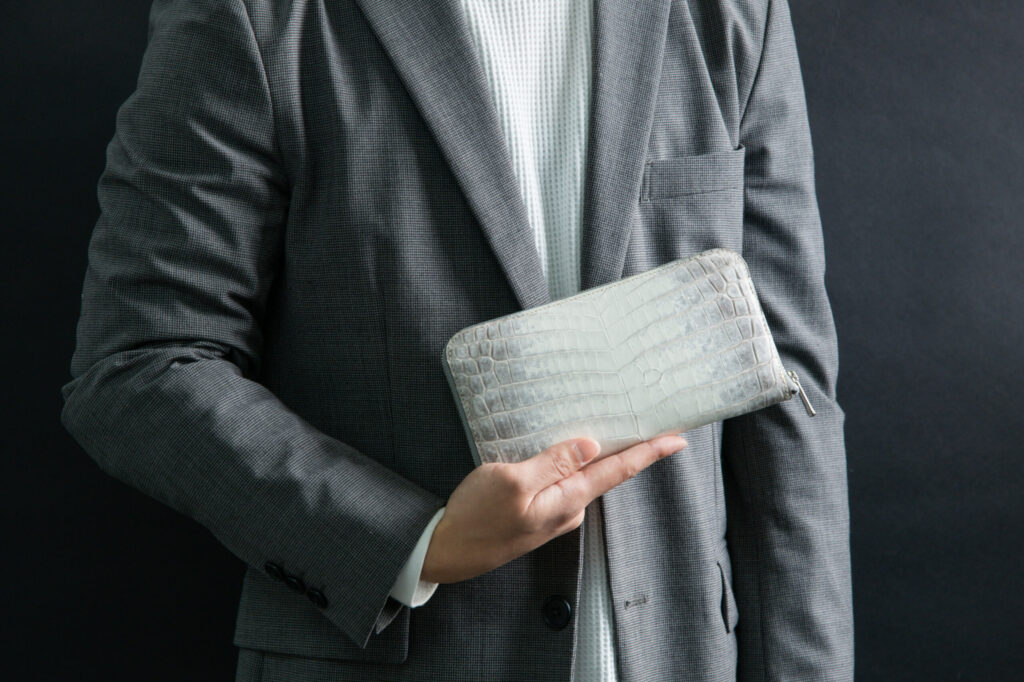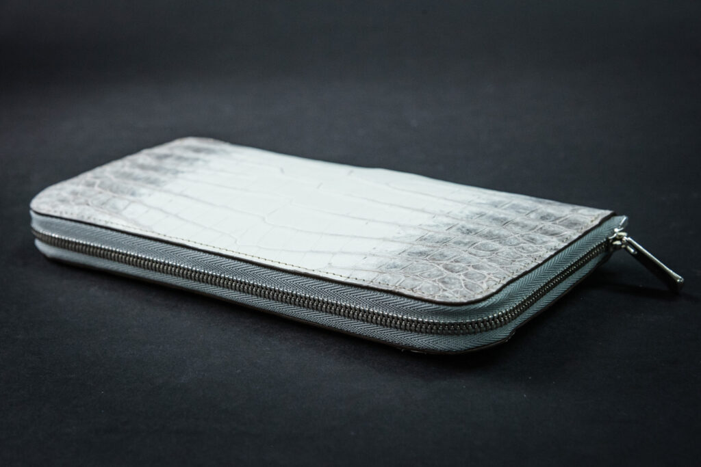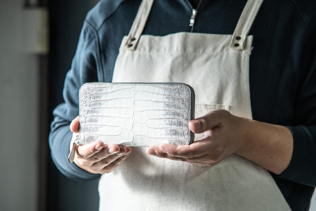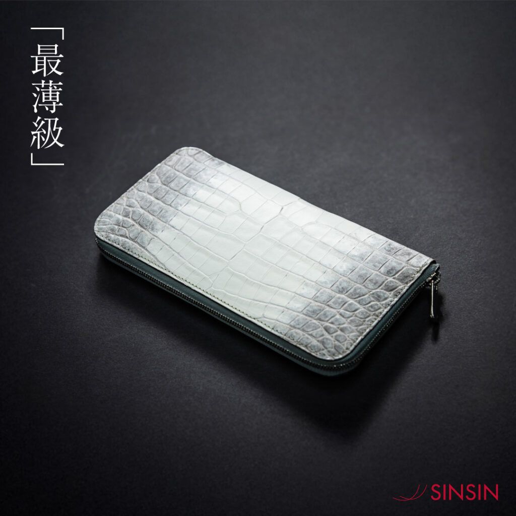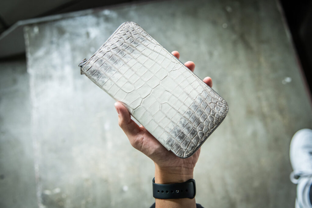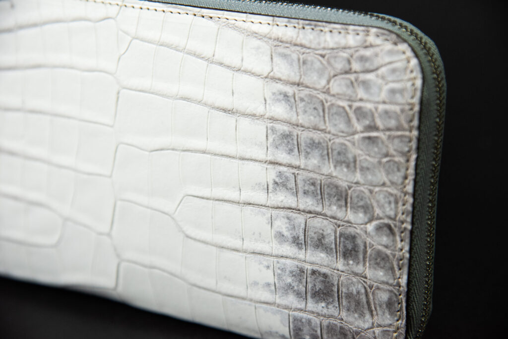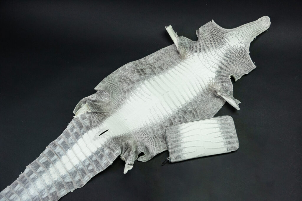 この作品に使用している「ヒマラヤクロコダイル-Snow white-」は、直接シンガポールの「ヘンローン社」から仕入れております。