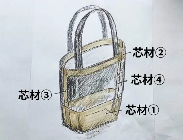 マチ部分に柱となる芯材を使用し(芯材③④)、屋根部分(芯材②)と床部分(芯材①)にあたる部分にも芯材を使用し、それぞれをステッチでつなぎ合わせることで型崩れしにくい設計にしました。(余談ですが、この構造を思いついたとき、悦に浸りました。笑)
