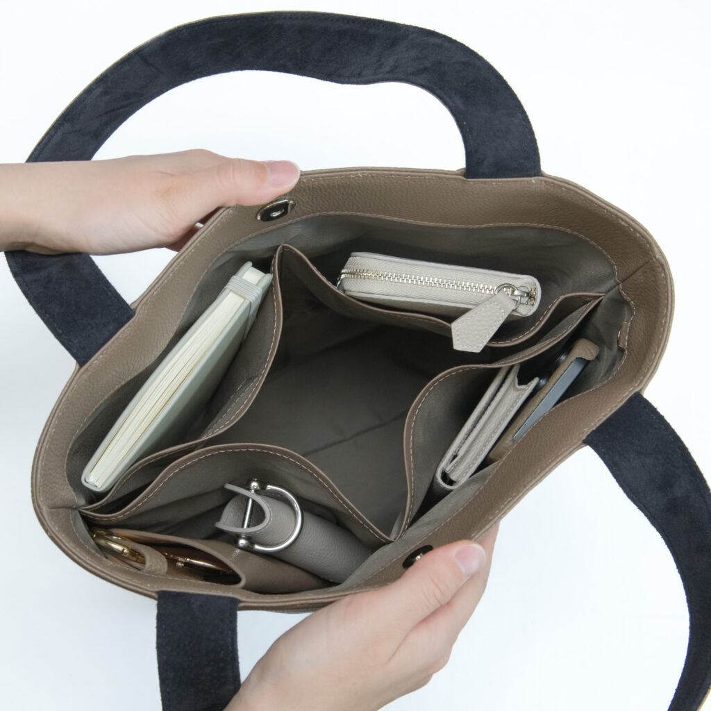 明るめの裏地を採用したので、バッグを広げた時光が反射し、取り出したいものをすぐに見つけることができます。