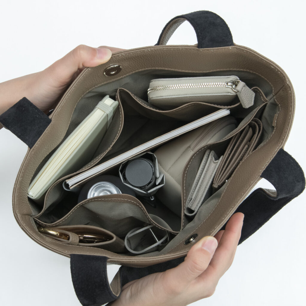 縦型トートでありがちな、「荷物がごちゃつく…」「下にある物が取り出しにくい!」という事が解消され、素早く物を取り出すことができます。