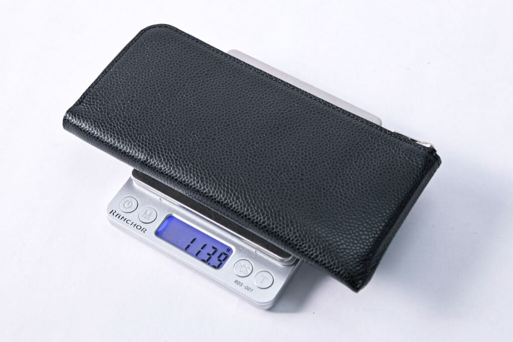 「極小長財布 フルート -Flute-」は不必要なパーツを取り除くことにより、オールレザーの長財布なのに、なんと「約120g」と、とても軽い財布にすることができました。