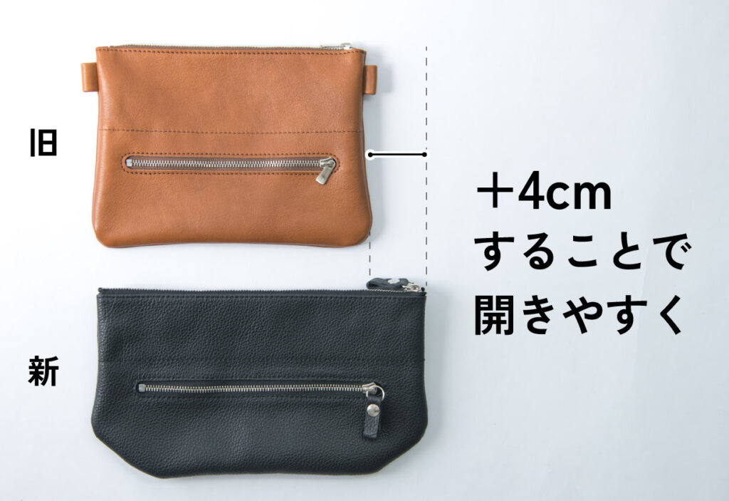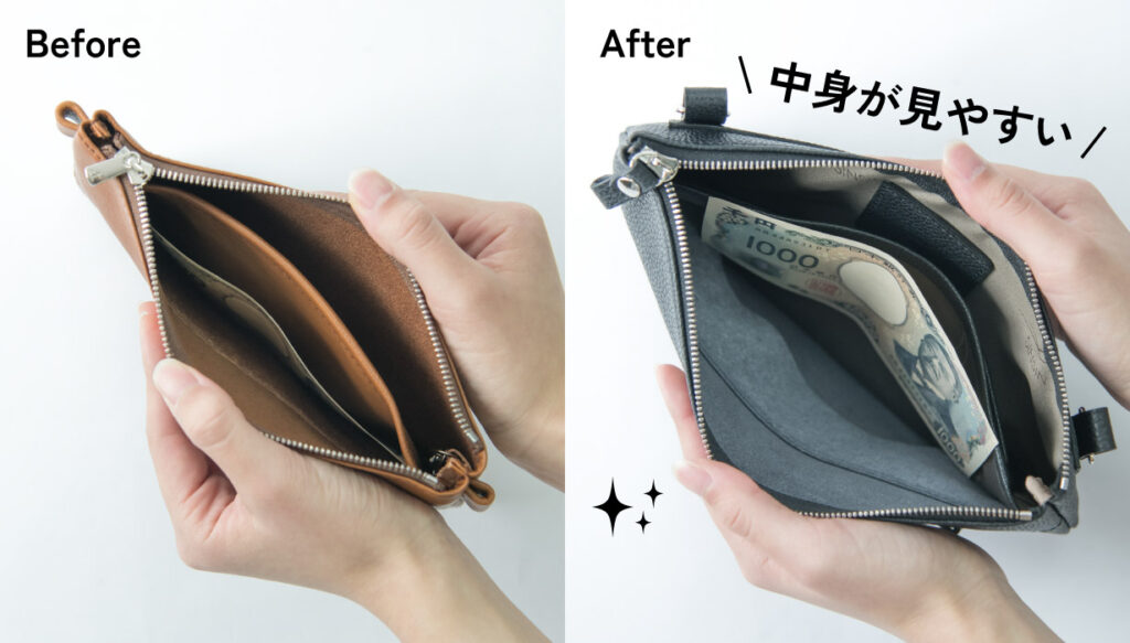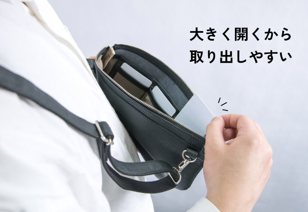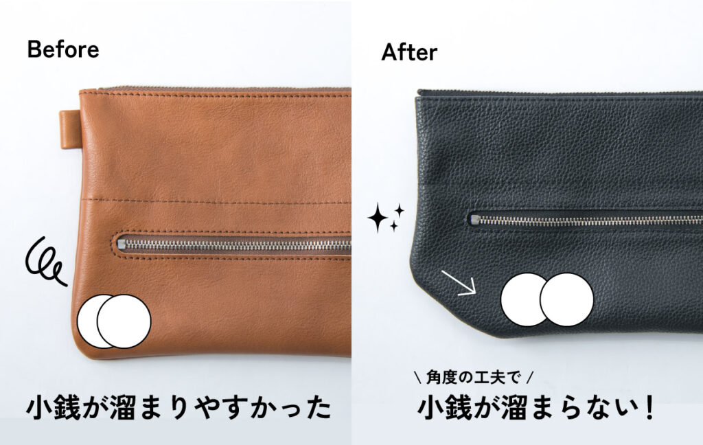 サコッシュの下部に角度を付けたことで、小銭が取り出しやすくなりました。
