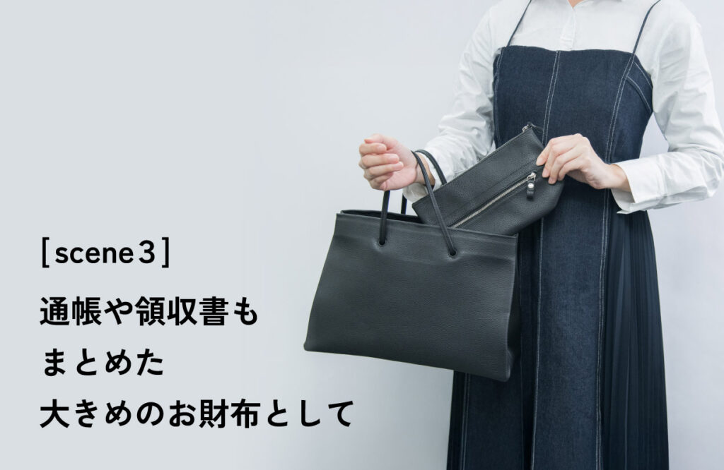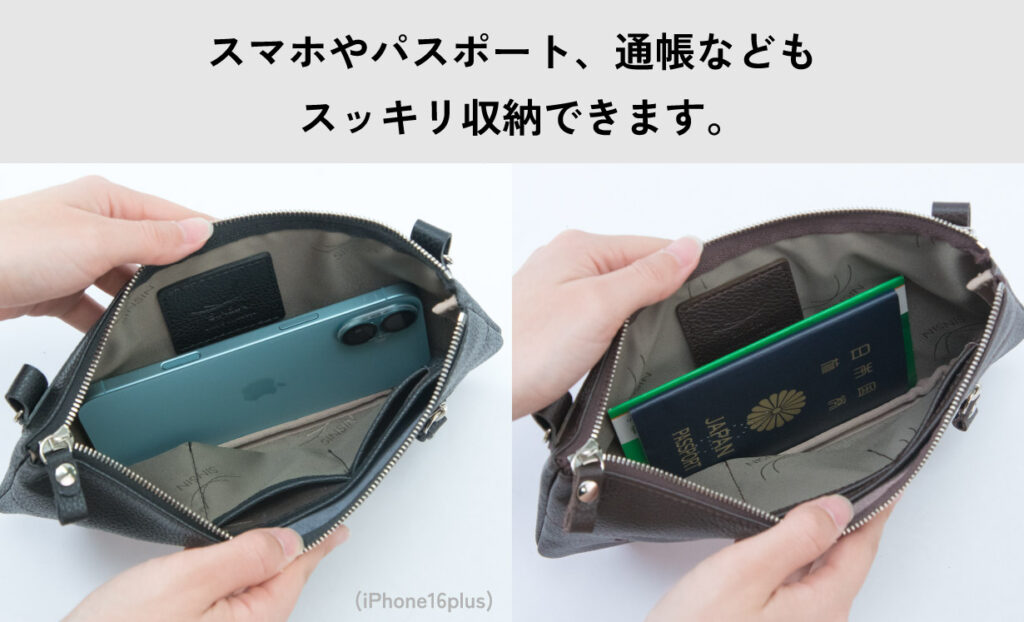 財布には入らないパスポートや通帳もひとまとめで持ち運べます。