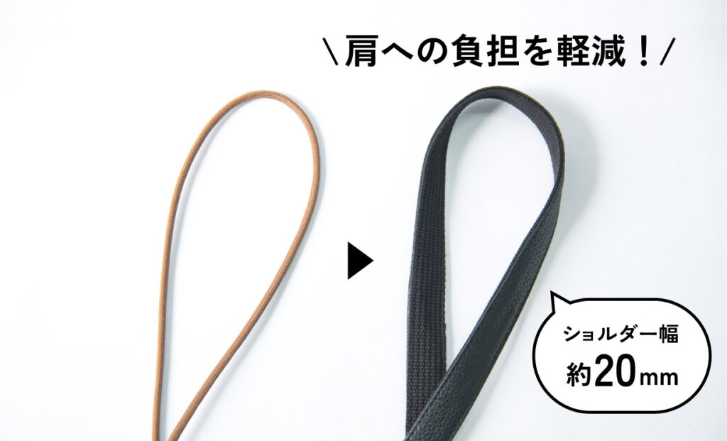 前作ではショルダーベルトをパラコードにしていたのですが、お客様から「肩へ食い込む」とのご意見をいただいたので、20㎜幅の革のショルダーベルトに変更して、肩への軽減を減らしました。
