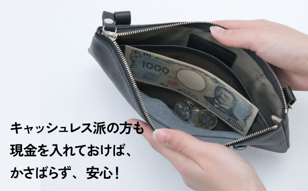 サコッシュに現金を入れるスペースがあるので、キャッシュレス派だという方でも万が一のときにアタフタせずに済みます。