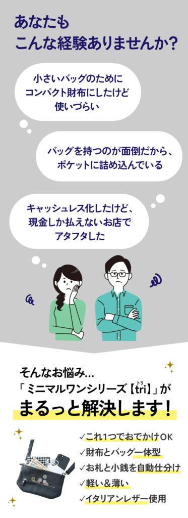 そんな悩みを解決する「お財布×バッグ」一体型サコッシュ【 tri [トリ] 】が完成しました!