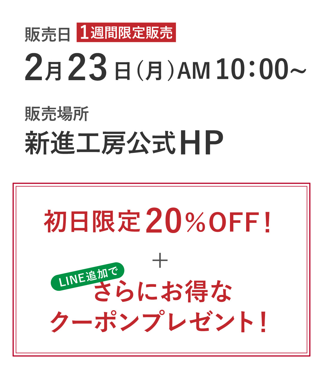 こちらの作品は販売初日限定で20%OFF。さらに、LINE登録の方限定で、販売直前にLINEにてクーポンプレゼントいたします。